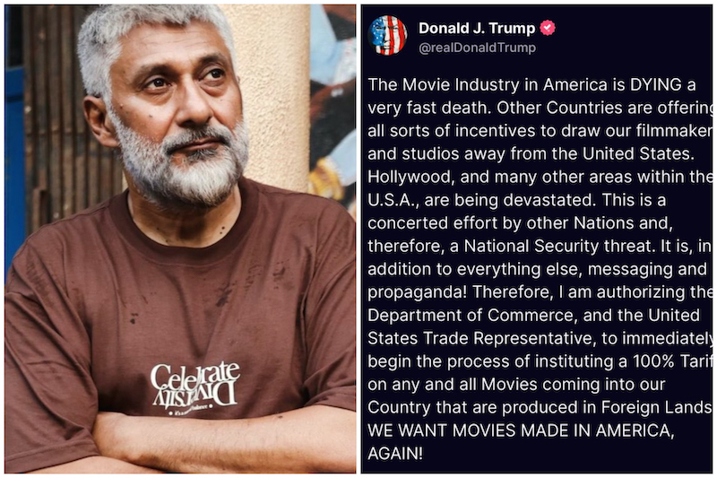 विवेक अग्निहोत्री ने सोशल मीडिया पर लिखा: चेतावनी: ट्रंप का 100% मूवी टैरिफ भारतीय सिनेमा के लिए खतरा है। अगर यह बेतुका फैसला लागू हुआ, तो भारत का पहले से जूझता फिल्म उद्योग पूरी तरह बर्बाद हो जाएगा, और उसे बचाने वाला कोई नहीं होगा। भारतीय फिल्म नेताओं को अब जागना होगा, एकजुट होना होगा, और इस खतरे से लड़ना होगा — न कि केवल पपराज़ी और आत्म-महिमा के पीछे भागना।”