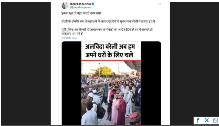सोशल मीडिया पर एक वीडियो तेजी से वायरल हो रहा है जिसमें बड़ी संख्या में लोगों को स्टेशन पर भीड़ के रूप में दिखाया गया है, जिनमें से अधिकतर ने मुस्लिम पारंपरिक टोपी पहन रखी है। इस वीडियो को लेकर यह दावा किया जा रहा है कि ये सभी लोग बरेली से पुलिस की कार्रवाई के डर से भाग रहे हैं, क्योंकि वे तौकीर रजा के कहने पर बरेली में इकट्ठा हुए थे और अब हिंसा के बाद पुलिस की कार्रवाई से डरकर शहर छोड़ रहे हैं।